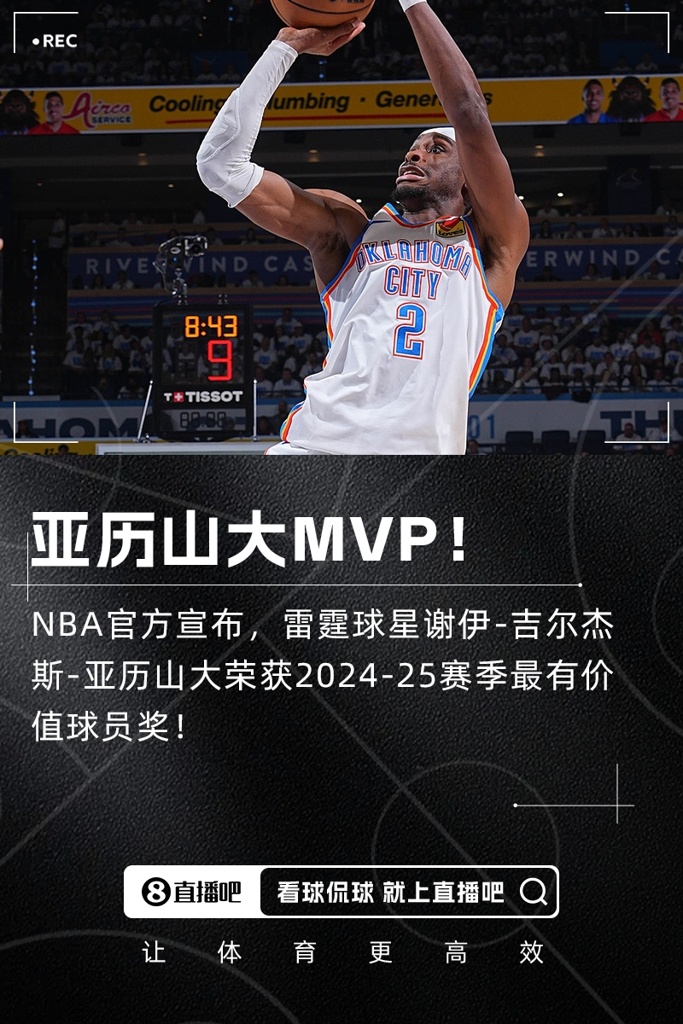 官方:雷霆球星亚历山大荣获本赛季MVP!