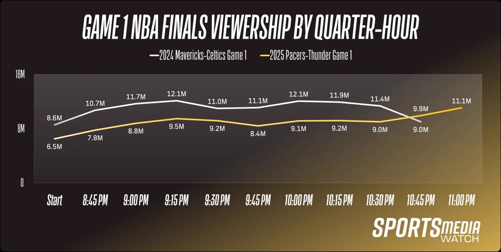 与去年独行侠对阵凯尔特人的总决赛G1相比(5.7%,1099万):今年的收视率下降了18%,观众人数下降了19%。若非步行者末节逆转,跌幅可能会更大。美国东部时间晚上10点45分开始的15分钟时段之前,观众人数比去年同期下降了23%(从1120万降至860万),但之比赛最后几分钟,观众人数相比去年凯尔特人大胜的最后几分钟(900万)反而增长了15%,达到1040万。
