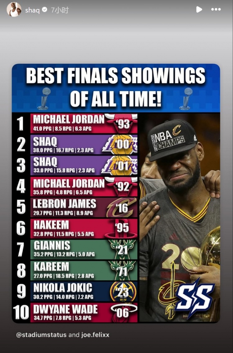 6月7日讯 今天,美媒INS排出了NBA单次总决赛个人表现Top10,奥尼尔进行转发,详情如下: