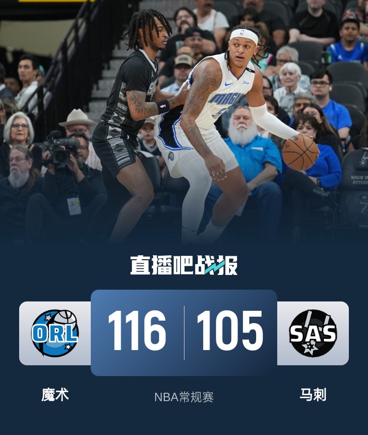 比赛开始,双方上来就接连外线对飙,巴恩斯三分再进领先到6分,随后双方外线继续手感火热,比分交替领先,卡斯尔干拔三分助马刺领先5分,次节小瓦格纳里突外投连砍12分带队追平比分,随后双方还是你来我往很胶着,波普外线依然稳健,半场双方打成61平。下半场,巴恩斯接连三分一波10-2领先到双位数,随后魔术进攻状态还是一般,休斯坦连续两记三分追到差5分,末节魔术发力重新追平比分,随后马刺突然断电,魔术打出12-2攻击波一举建立领先,波普连续三分杀死比赛,最终魔术116-105力克马刺,送对手5连败。