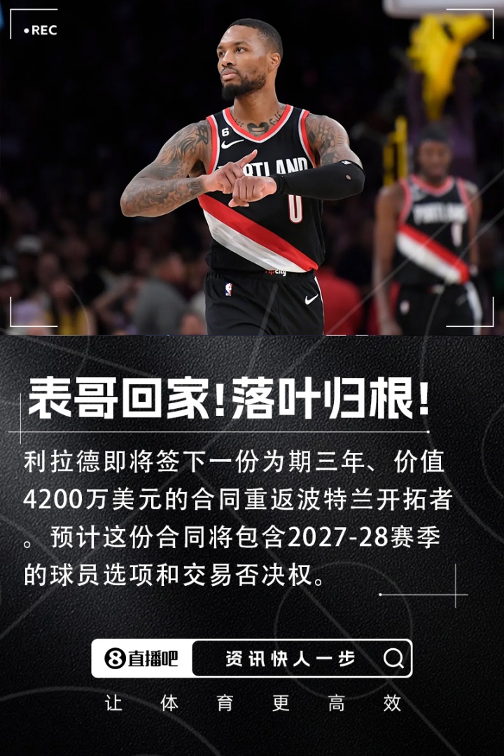 利拉德3年4200万美元重回波特兰!ESPN评级:开拓者A-
