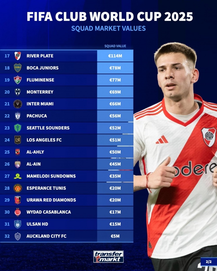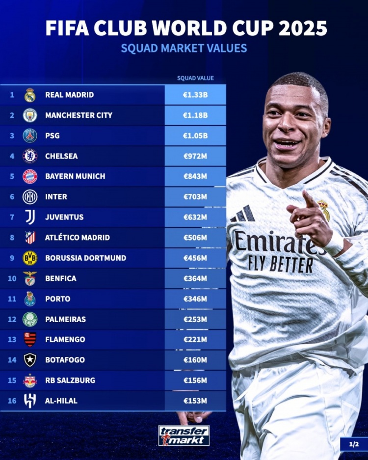 世俱杯球队身价排行:皇马13.3亿欧居首 迈阿密第21 榜尾仅500万