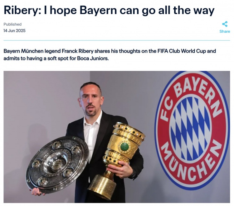 里贝里:“我是博卡青年的超级粉丝,我真心热爱这支球队。我希望有一天能去阿根廷,因为那里的氛围太棒了。我相信博卡真的有机会赢得世俱杯。他们的打法、心态和思维方式都是一流的。这对博卡青年将是一次严峻的考验,但拜仁和其他任何球队也同样如此。很难预测冠军归属,甚至球队能走多远。我会尽量关注比赛进程,但要控制好自己的情绪。”