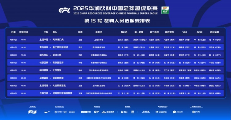 6月25日讯 中超联赛官方公布了第15轮裁判选派名单,金京元执法申花vs津门虎,艾堃执法海港vs英博。