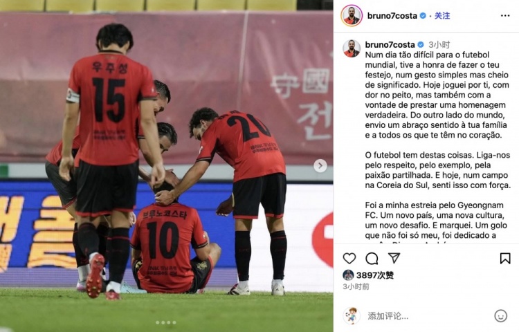7月6日讯 韩国K2联赛,第19轮,庆南1比1战平安山绿人。庆南前锋布鲁诺-科斯塔为球队打进扳平一球,赛后,作为若塔前队友的布鲁诺-科斯塔更新社交媒体,他表示将进球献给若塔兄弟。