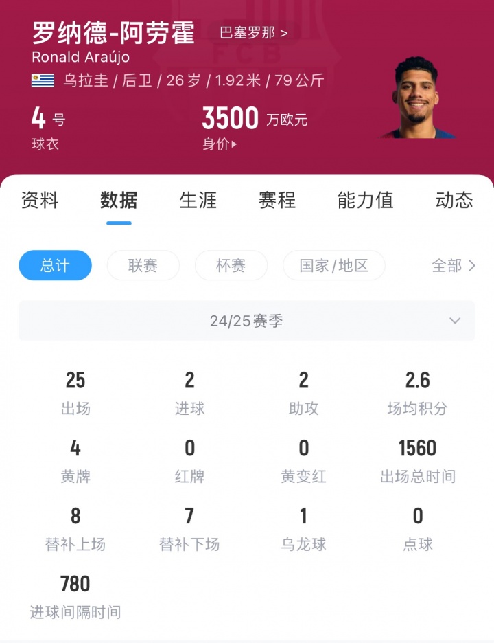 26岁的阿劳霍上赛季由于伤病原因,仅为巴萨出场25次。他目前的身价仅剩3500万欧。