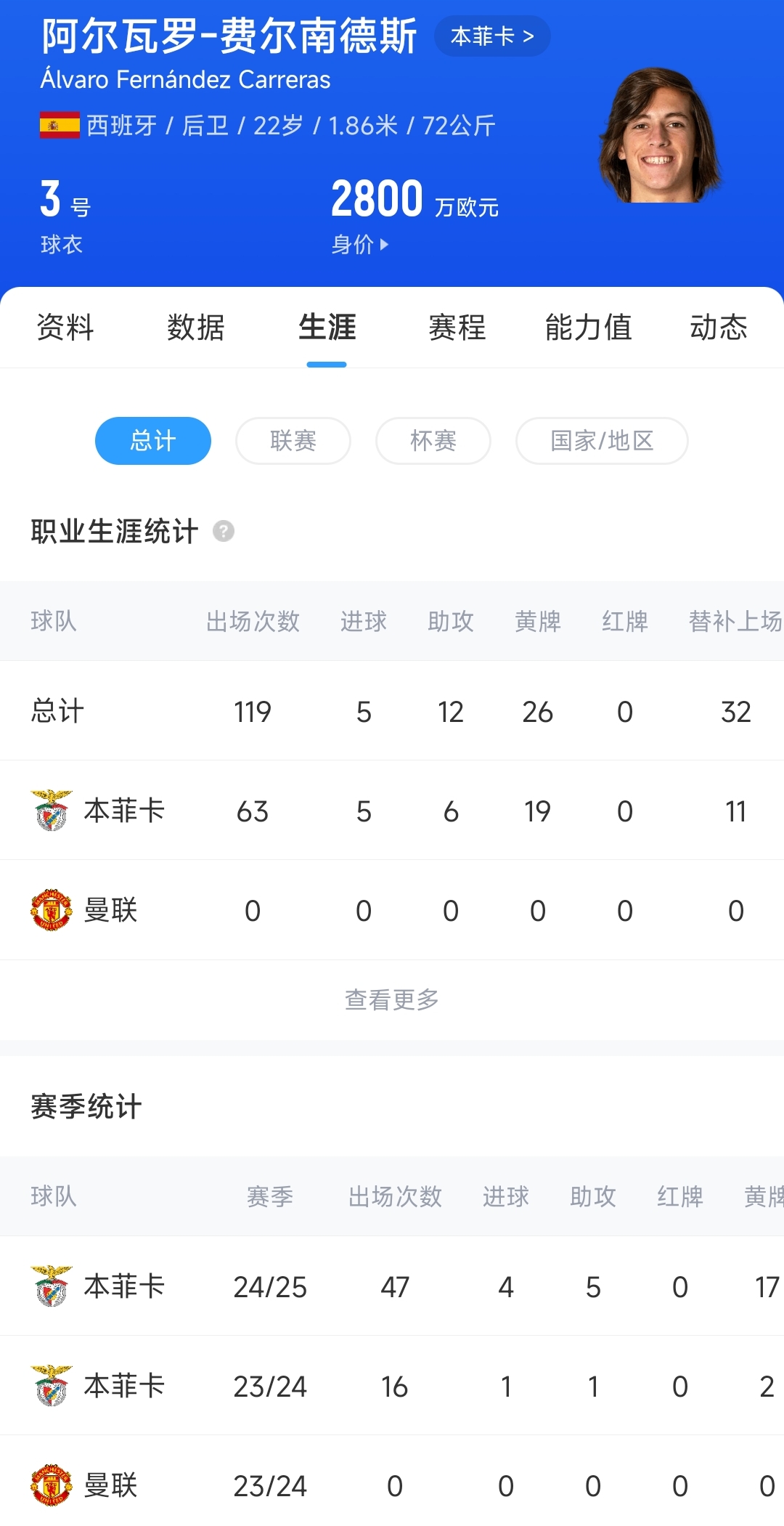 早在2017年,14岁的A费就加入了皇马青训,但因为缺乏机会,A费在2020年转投曼联。随后A费被曼联多次外租,并在2024年被本菲卡买断。随着在本菲卡的出色表现,22岁的A费德转身价已经达到了2800万欧元。